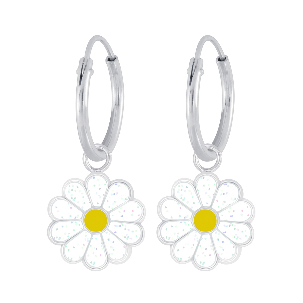 Silver Daisy Flower Charm Hoop Earrings - 6020