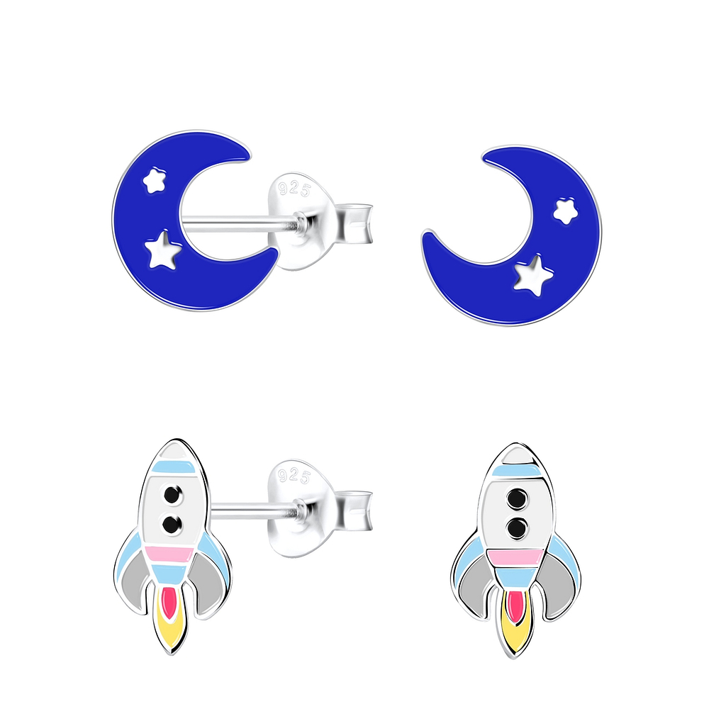 Silver Moon and Rocket Stud Earrings Set - 16818