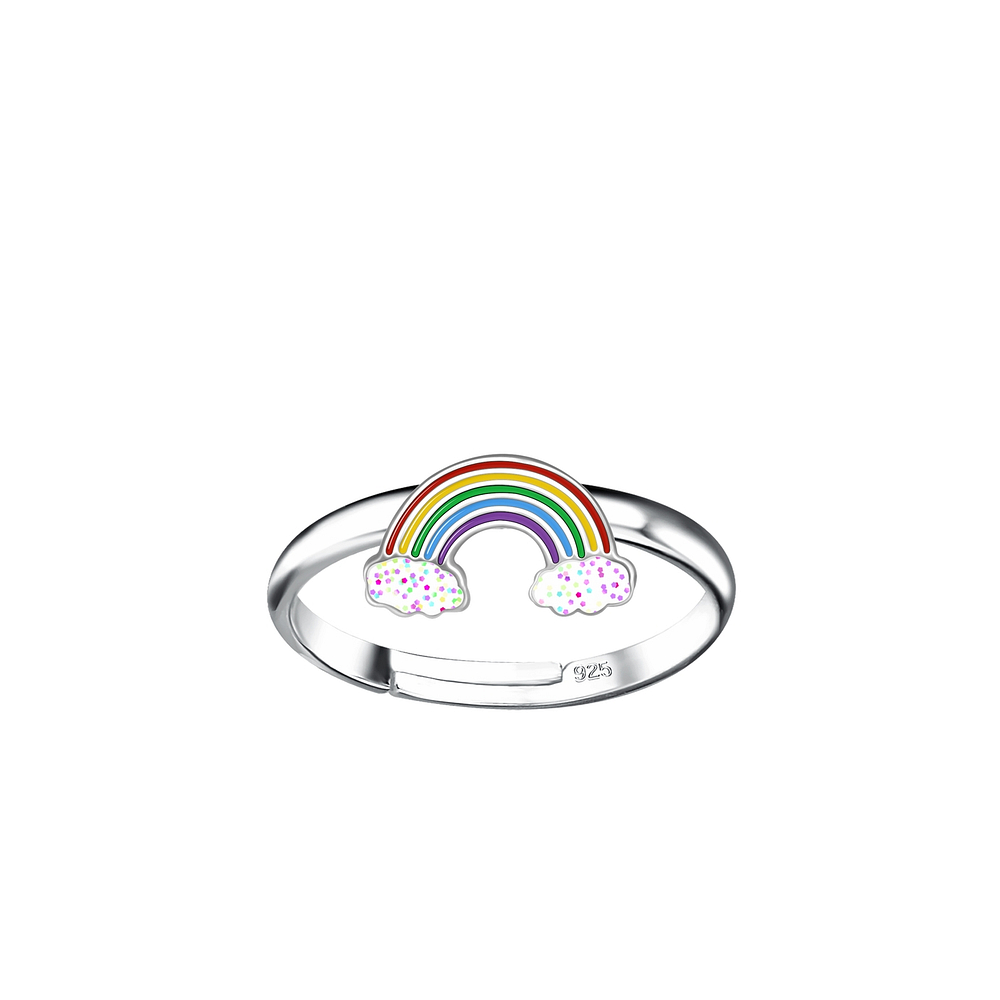 Our Wholesale Silver Rainbow Adjustable Ring - 17825, part of the Rainbow & Colors collection, is a playful kids' ring with an enamel charm, adjustable fit, and a Rhodium finish