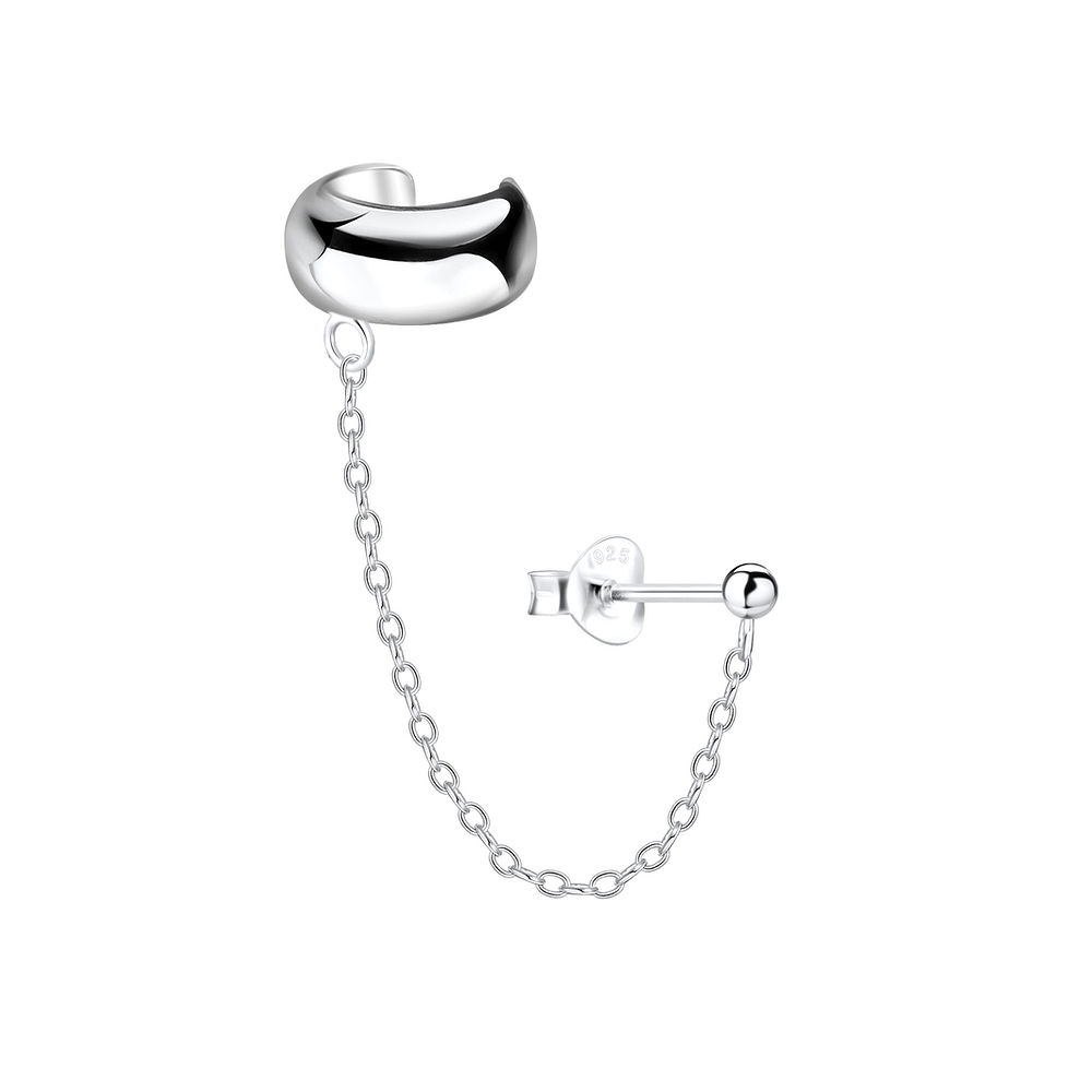 Silver Ball Stud Earring and Ear Cuff with Chain - 3209