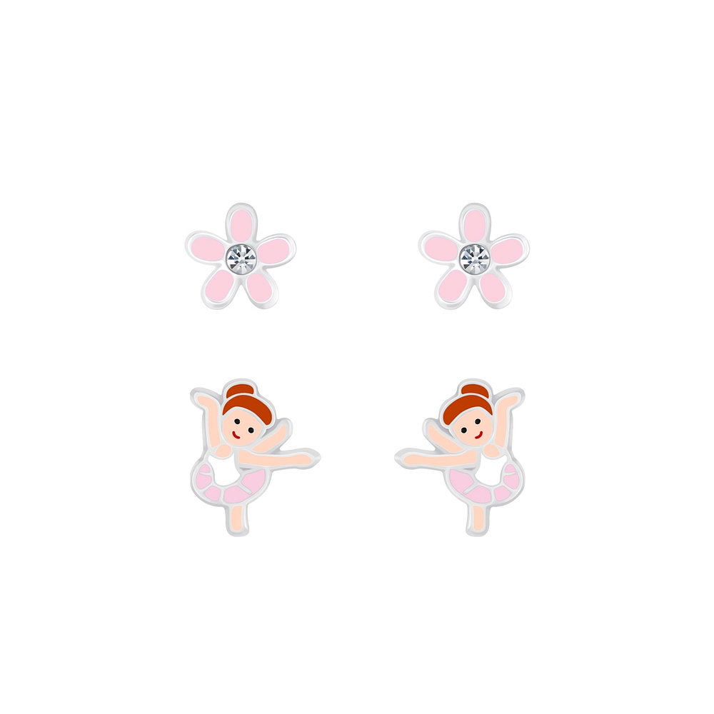 Silver Ballerina and Flower Stud Earrings Set - 7621