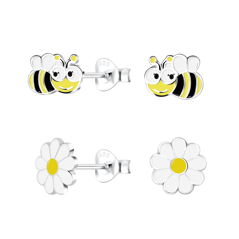 Silver Bee and Flower Stud Earrings Set - 22300