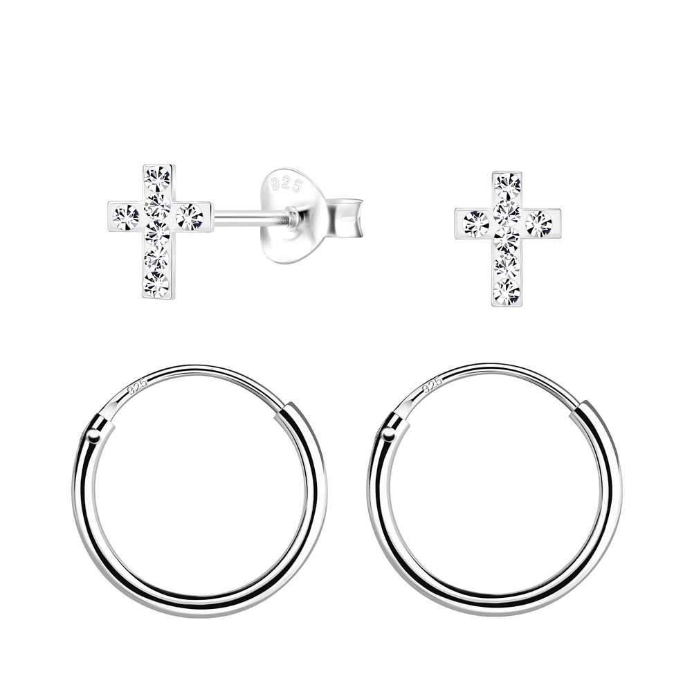Silver Cross Stud and Hoop Earrings Set - 22349