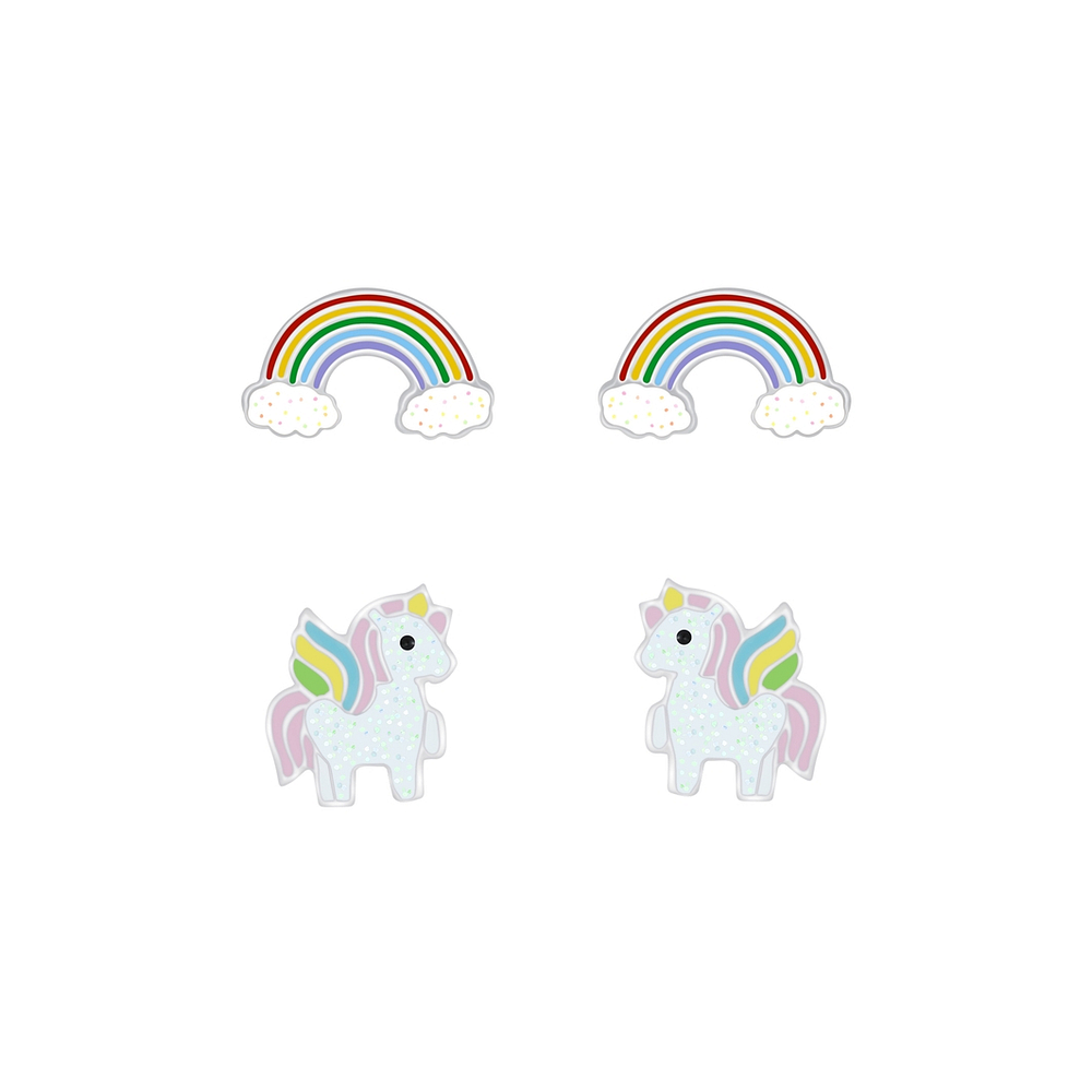 Silver Rainbow and Unicorn Stud Earrings Set - 7645