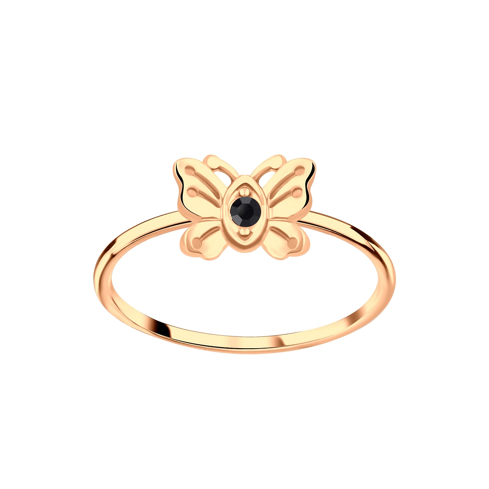 The Wholesale Silver Butterfly Crystal Ring - 5782 in 925 sterling silver has a Rose Gold + E-Coat (Anti-Tarnish) finish, giving a luxurious look. Offered in sizes 6, 7, 8, each piece is hypoallergenic and weighs about 0.96g.