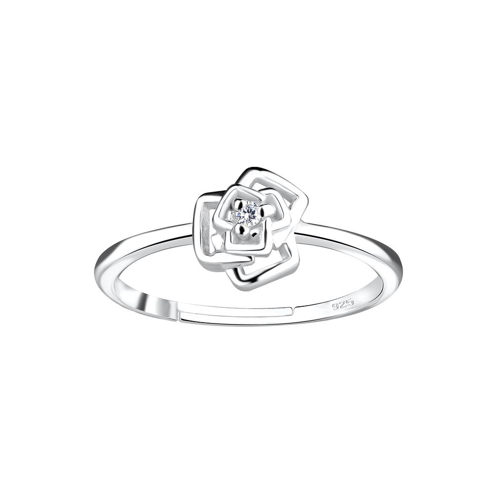 The Wholesale Silver Rose Flower Adjustable Ring - 16440 in 925 sterling silver has a Silver + E-Coat (Anti-Tarnish) finish, giving a unique look. Offered in sizes Adjustable (6-8), each piece is hypoallergenic and weighs about 1.43g.