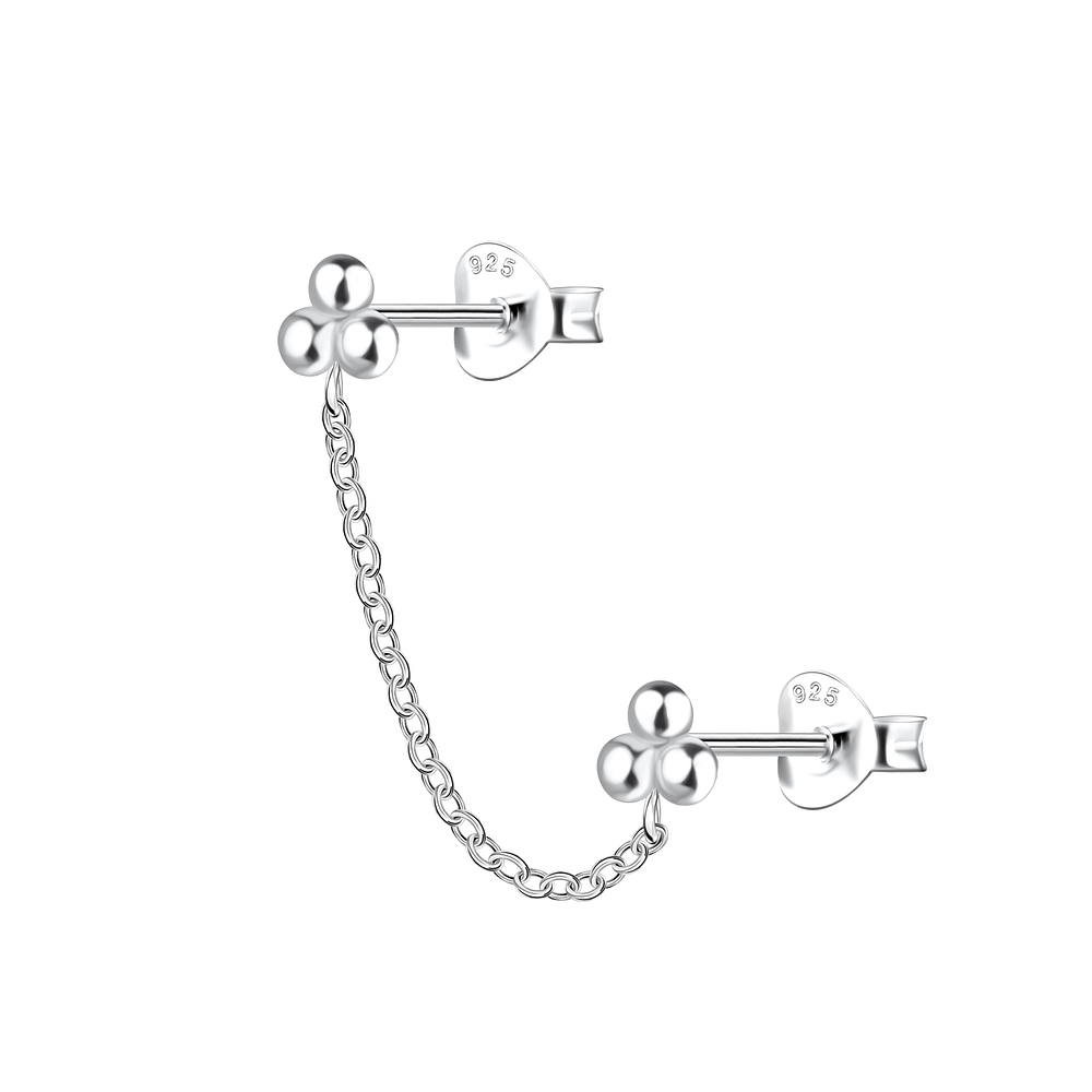 Silver Ball Double Stud Earrings with Chain - 22465