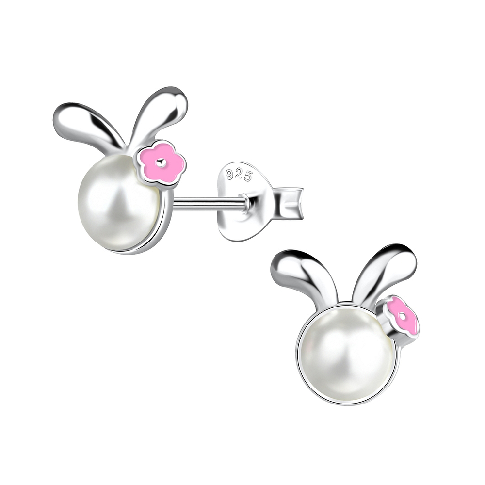 The Wholesale Silver Bunny Stud Earrings - 19723 are chic 925 silver earrings with a Silver + E-Coat (Anti-Tarnish) finish. Hypoallergenic and studded with Imitation Pearl, for the perfect Animal collection