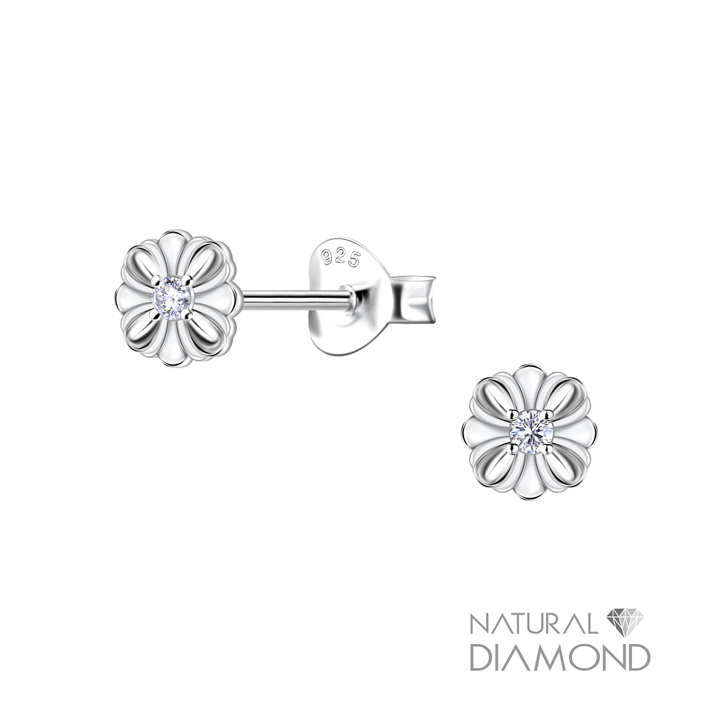 Silver Flower Stud Earrings With Natural Diamond - 22690