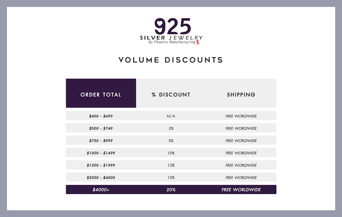 At 925SilverJewelry, we know how important it is for our customers to receive high-quality sterling silver jewelry for the right price. That is why we want you to get access to the best deals when buying in bulk with us.